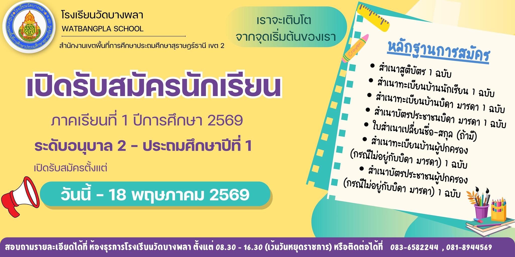 เปิดรับสมัครนักเรียน ระดับชั้น อนุบาล 2 -ป.1 ประจำปีการศึกษา 2568 #ประชาสัมพันธ์โรงเรียนวัดบางพลา เปิดรับสมัครนักเรียน ประจำปีการศึกษา ระดับชั้น อนุบาล 2 -ป.1 ตั้งแต่วันนี้ - 18 พฤษภาคม 2569 |